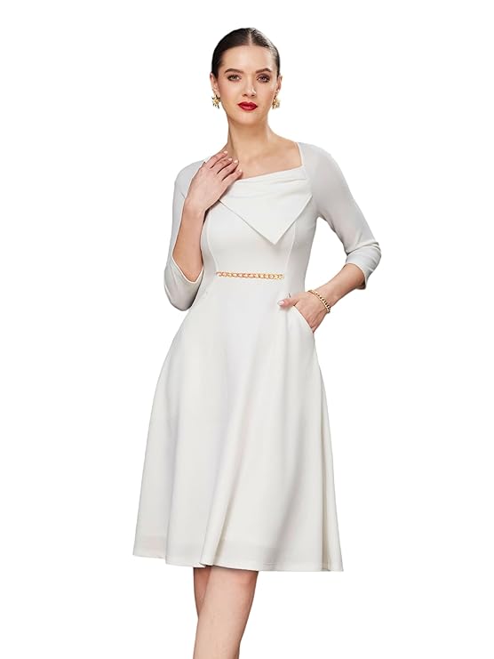 Miss Chase Women's Solid Square Neck Raglan Sleeves Side Pocketed Polyester Fit and Flare Knee Length Dress